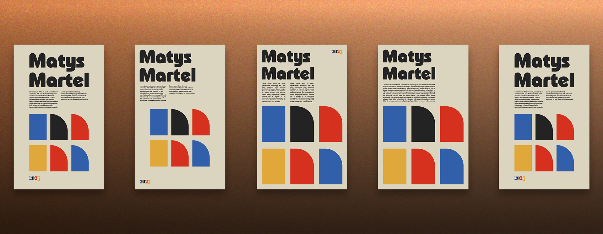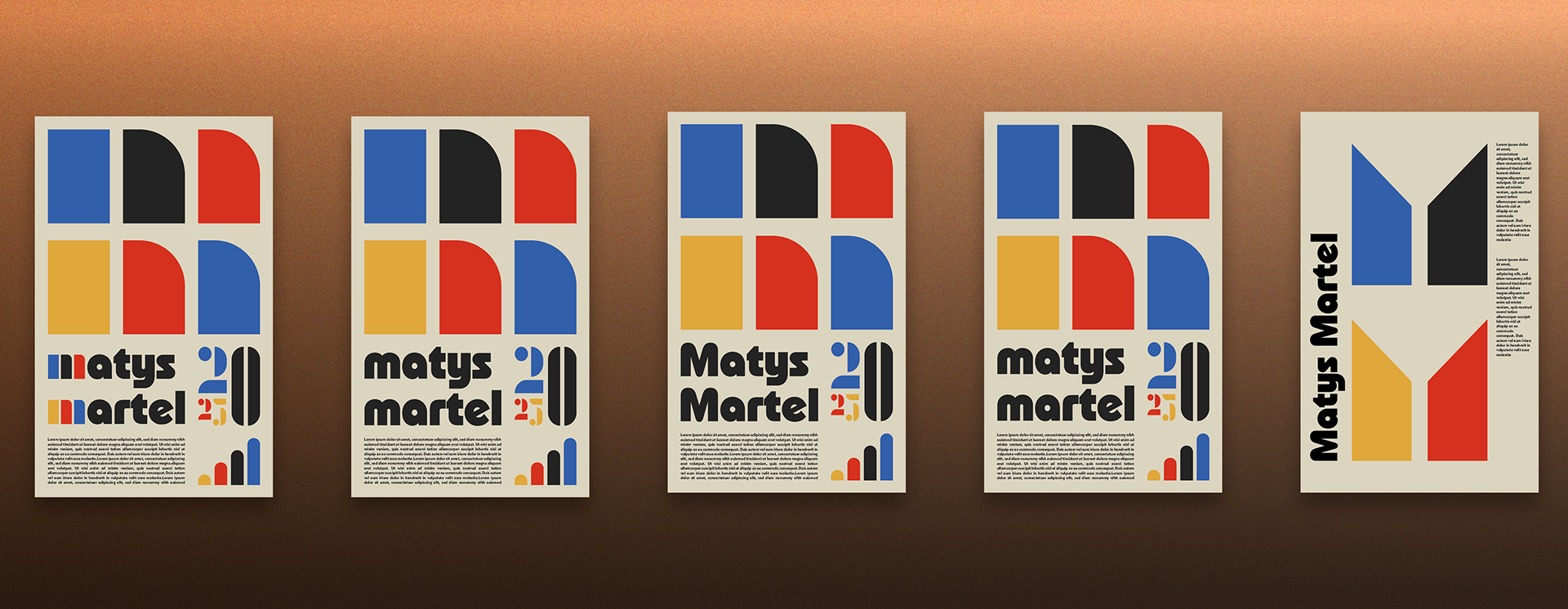 Mes premières itérations de l’affiche avaient comme but de tester les proportions des éléments, ainsi que leur positionnement. Ces tests m’ont permis de réaliser le manque d’alignement dans les compositions, ainsi qu’un manque de lisibilité pour mon monogramme.